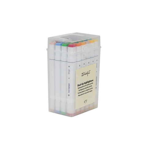 Este set vem numa prática caixinha de plástico transparente com 24 marcadores de cores vibrantes, todos de dupla ponta. De um lado, tens a ponta fina, perfeita para escrever ou fazer detalhes; do outro, uma ponta mais larga, ideal para sublinhar ou destacar o que é mais importante.
