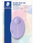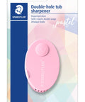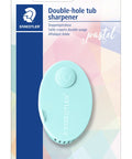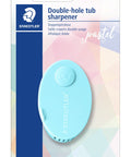 Afia dupla de plástico com depósito colorido para lápis até 8,2 mm Ø e lápis grossos até 10,2 mm Ø, tampa transparente com fecho de segurança.