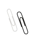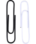 Caixa com 80 clipes de plástico pretos e brancos de 50mm. Os clipes são essenciais para organização de documentos em papel no escritório ou para ajudar no estudo agrupando os apontamentos.