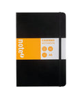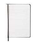 Caderno pautado agrafado A5 com capa dura e cantos arredondados. Inclui elástico exterior para manter o caderno fechado protegendo as folhas, e ainda uma fita marcadora no interior. O caderno tem 96 folhas com gramagem de 80g/m2.
