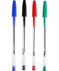 conjunto de 4 canetas esferográficas de traco médio de tinta azul, vermelha, preta e verde ideais para utilizacão diária em âmbito escolar, profissional e até em casa. a tinta seca rapidamente e tem uma longa duracão. tampa da cor da tinta com clip para prender nas folhas.