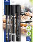 Marcadores permanentes lumocolor, sem dissolventes tóxicos e inodoro, com larguras de linha diferentes.
