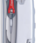 O compasso Stop System conta com um sistema patenteado que tranca as pernas na sua posição, para maior segurança e precisão. O conjunto inclui 1 compasso, 1 suporte universal para lápis e 1 pacote de minas.
