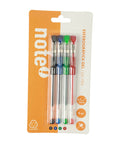 Conjunto de 4 canetas esferográficas de tinta de gel. O fluxo de tinta fluído permite uma escrita confortável e suave. A pega macia torna a esferográfica mais ergonómica e a tampa tem um clip na ponta para prender nas folhas. O conjunto é composto por 1 esferográfica azul, 1 preta, 1 vermelha e 1 verde.
